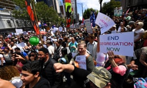 Melburnians march through the streets in protest against vaccinate. Australias Victoria state has shut construction sites across Melbourne following a violent protest against mandatory Covid-19 vaccines. Demonstrators march through Melbournes CBD on Saturday protesting the Victorian governments vaccine mandates and proposed pandemic legislation. Victoria Police arrested 31 people at a shopping complex.